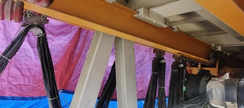 4、調(diào)整牽引鋼絲繩,工字鋼滑車使其長度小于同節(jié)電纜長度,運行時由牽引鋼絲繩受力。