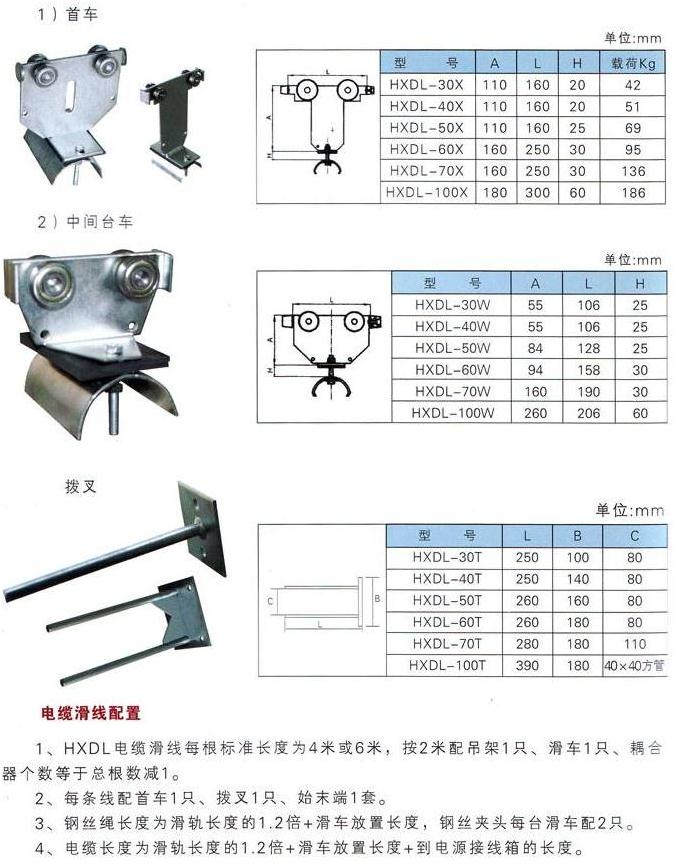 HXDL系列移動電纜滑線有軌道、電纜小車、電纜以及懸吊、固定等組件組合而成。該產(chǎn)品以其簡潔的結(jié)構(gòu)、完備的性能被廣泛地應(yīng)用于鐵路貨場、港口碼頭等起重運輸機械的移動供電和信號傳輸系統(tǒng)中。 型號規(guī)格 軌道截面尺寸(mm) 適配小車型號 A B C D HXDL-33 33 40 14 2.0 DTC-33 HXDL-40 40 40 14 2.0 DTC-44 HXDL-50 50 50 16 2.5 DTC-50 HXDL-60 63 18 18 4.0 DTC-60 HXDL-70 72 68 22 4.0 DTC-70 HXDL-100 100 100 35 6.0 DTC-100 注:1、軌道標準長度:4m、6m。2、軌道材料:冷軋鋼板、不銹鋼板